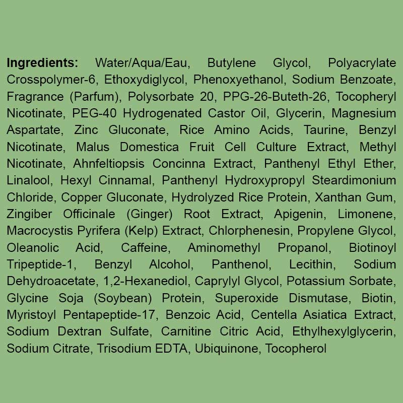 Supports healthy hair function in areas of thinning. An intensive, advanced leave-in treatment serum to help inhibit the effects of DHT (Dihydrotestosterone) on the hair and scalp, strengthening hair follicles in the process. Protects and strengthens follicles for thicker, fuller looking hair. Contains stimulating activators that assist in increasing cellular energy and microcirculation on the scalp, creating a better foundation for healthy hair growth.