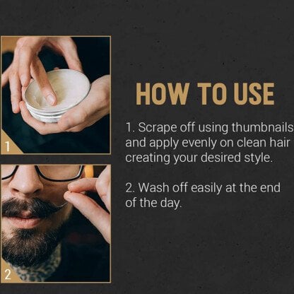 Easily shapes and molds your moustache. Beeswax and Coconut Oil add lasting volume and provide superior control without any grease or lingering residue.